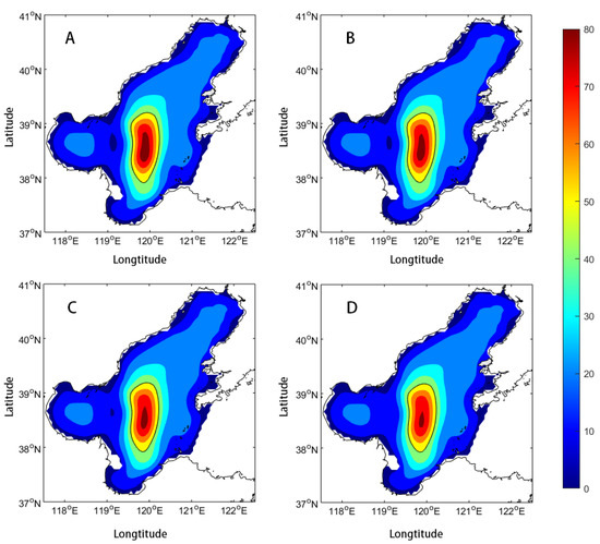 The adjoint assimilation model is based on the rectangular coordinates, where the parameters settings refer that in Wang et al. (2013) [48]. The computing area spans over the domain of 117.5° E~122.5° E and 37° N~41° N, with the grid spacing of 4′ × 4′. The model is divided into five layers vertically, whose thicknesses are 10 m, 10 m, 10 m, 20 m and 25 m from top to bottom, respectively. The time step is set as 1 h.