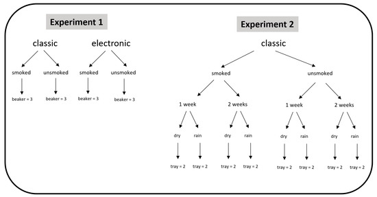 This study consisted of two separate multifactorial experiments (Figure 1). The first was used to determine which type of butt, the classic (CCB) or the electronic (ECB), was more toxic. To determine this, an experiment in the traditional and most direct form, namely the preparation of leachate, was conducted in artificial sea water (ASW; the composition can be found in the Supplementary Materials). Toxicity was assessed with both smoked (S-) and unsmoked (U-) cigarettes to investigate the role of combustion in determining toxicity. A three-factor nested experimental design was applied: “cigarette type” (ECB vs. CCB, two levels fixed); “combustion” (smoked vs. unsmoked, two levels fixed) and “beaker” (i.e., replicates, three levels, random).
