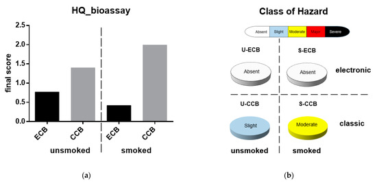 A synthetic view of the results obtained is reported in Figure 2; in smoked classic CBs (S-CCBs) showed the highest negative score in terms of Battery Bioassay Hazard Quotient (HQ = 1.99) and the corresponding Class of Hazard (i.e., moderate).