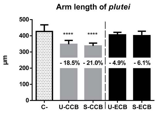 Mean length (±SD) of arms in normo-formed 72 h old plutei of P. lividus exposed to leachates of smoked (S-) and unsmoked (U-) cigarette butts from classic (CCB) and electronic (ECB) cigarettes. C- = negative controls. Statically significant differences, compared to controls, were calculated in specimens exposed to CCBs (**** = p-value < 0.0001), and corresponded to an arm length reduction of up to 21.0% and meaningless differences within the factor “combustion”.