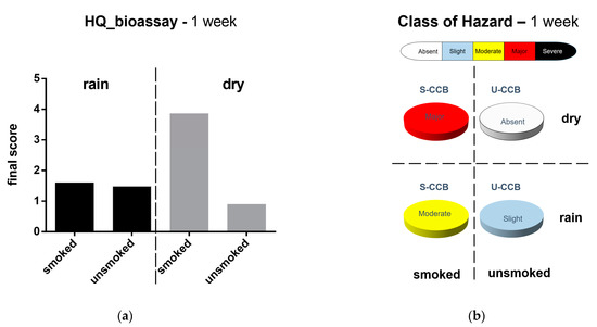 Evaluation of ecotoxicological bioassay. Marine species were exposed to elutriates prepared from both smoked and unsmoked CCBs subjected to different atmospheric conditions (rain vs. dry) for 1 week. (a) Hazard Quotient of the battery of bioassays; (b) class of hazard. Calculations and categorization are those reported by Sediqualsoft®.