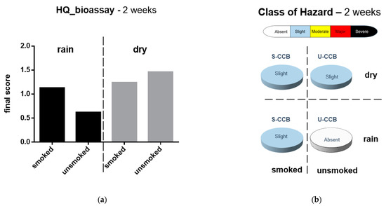 Evaluation of ecotoxicological bioassay. Marine species were exposed to elutriates prepared from both smoked and unsmoked CCBs subjected to different atmospheric conditions (rain vs. dry) for 2 weeks. (a) Hazard Quotient of the battery of bioassays; (b) class of hazard. Calculations and categorization are those reported by Sediqualsoft®.