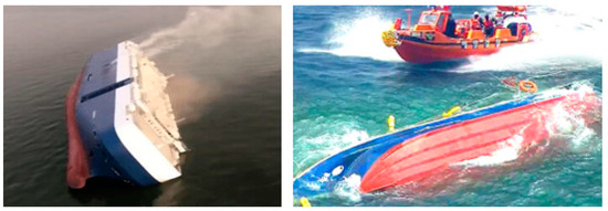For the safe navigation of ships, maintaining sufficient stability according to Internation Maritime Organization (IMO) stability regulations is essential. Due to the lack of sufficient stability, many ship capsizing accidents have been reported, such as the Golden Ray car carrier accident on 8 September 2019 in Georgia, the United States, and the Dolgorae fishing vessel on 5 September 2015 in the Chuja Islands, as shown in Figure 1 [1,2].