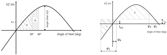 Figure 2 (left) shows three patterns of the area under the GZ curve in the IMO stability regulation. Figure 2 (right) shows the weather criterion. The steady wind pressure on the ship leads to a heeling arm (). As a result, a heel angle () is generated to achieve equilibrium, and the wave motion causes the ship to heel with an angle () against the wind. At this moment, it should not exceed the value of 16° or 80% of the immersion angle, whichever is less. Moreover, due to the gust wind pressure, the ship is subjected to inclination. In this case, the area of “d” should be larger than the area of “c”.