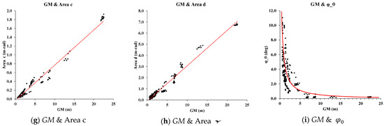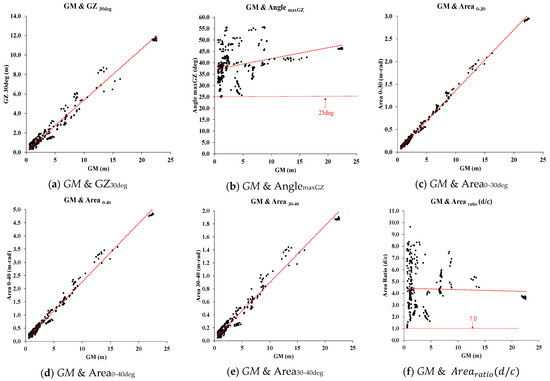 For the fitting procedure of the IMO intact stability parameters according to GM, the linear function using the method of least squares was introduced for eight parameters except for the heeling angle . The reciprocal function using the method of least squares was introduced for the heeling angle to improve the coefficient of determination as shown in Figure 3i. As shown in Figure 3b,f, it is problematic for and to derive proper formulas due to the low correlation. In terms of the IMO intact stability regulations for the two parameters, all their values comply with the IMO intact stability requirements as they are over 25 deg and 1.0, respectively, as shown in Figure 3b,f.