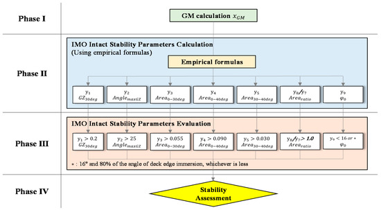 The SEMIS can simply evaluate the seven IMO intact stability parameters according to GM. Finally, according to the evaluated parameters, the safety of ships’ stability is assessed. Figure 4 shows the details of the procedure of the four phases of SEMIS.
