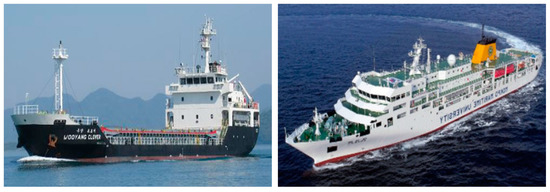 Two types of vessels were introduced to validate SEMIS. The basic information and general layout of the two vessels are presented in Figure 5 and Table 6. The first model ship was a 5600-ton class general cargo ship operated in the East Asia sea. The deadweight of the general cargo ship was 3600 ton. The second model ship was a 9100-ton class maritime university training ship operated. The deadweight of the training ship was 3600 ton and it was able to accommodate 239 persons.