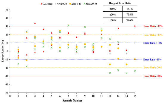 The parameters with an error ratio of over 30% are indicated in blue and those that are non-compliant with the IMO stability regulations are indicated in red in Table 8. Additionally, Figure 6 shows the parameters, except for the heeling angles with an error ratio between +50% and −50% compared to the results using the principal methods. As shown in Figure 6, the error ratio of the four parameters of , , , and under ± 30% is 96.6%. Moreover, the error ratio of the four parameters under ± 10% is 49.1%. The average error ratio of the four parameters is 13.9%. Although the parameter of GM of the general cargo ship in scenario 13 complies with the IMO regulation as it is over 0.15 m, the SEMIS successfully evaluates unsatisfied parameters such as Area0–30 and Area0–40 of the GZ curve and the heeling angles .