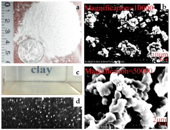 Carbopol® Ultrez™ 10 is a cross-linked polyacrylic acid polymer that provides efficient rheology modification with encased self-wetting for ease of use [12]. U10 has many typical features and benefits, such as short floe properties, high viscosity, and high suspending ability. The particle size, specific gravity, and specific surface area of U10 used in this paper were 50~100 mm, 1.4543, and 0.21 m2/g, respectively. The photos of U10 powder materials and SEM images of 1 × 104 and 5 × 104 magnification are shown in Figure 1a,b. U10 polymer powder shrinks in contact with water. When the powder disperses in water, the cross-linked acrylic resin chain begins to spread. After neutralization with an alkaline substance, the polymer structure expands. From dry to gelled polymers, the volume may increase by 1000 times.