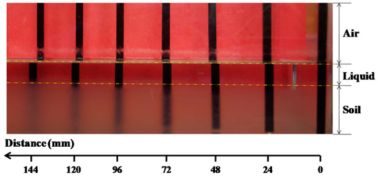 To quantify the optical characteristics of transparent materials, a relative transparency (RT) method was introduced in this paper. Target tests with a black background, viewed through transparent materials of different thicknesses (24 mm intervals), were carried out. The test target sign viewed through air and liquid can be seen in Figure 2. A camera (Canon 550D) with 18 million effective pixels within a 50 cm distance was used to photograph the figures through the target layout with transparent materials of different thickness. Pixel intensities (I, grayscale intensity values for black and white, = 0 and 255, respectively) could be obtained for each photo and each window of one photo. The figure at 0 distance was used as a reference map, and the transparency of the test target was analyzed, thus reflecting the transparency level of transparent materials. As shown in Figure 3, the RT values of transparent materials can be calculated as