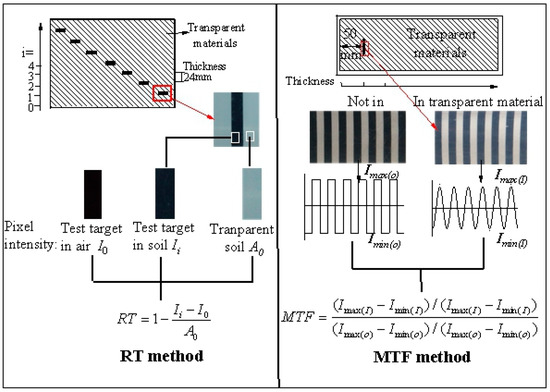 where RT is the relative transparency, Ii (i ≥ 0) is the pixel intensity of the test target at various depths of transparent materials, I0 is the first pixel intensity of the test target placed in air (0 mm depth in transparent materials), and A0 is the pixel intensity of transparent soil.