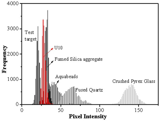 Pixel intensity frequency of the test target in a transparent medium of 50 mm thickness.