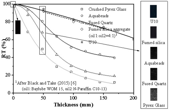 Transparency of materials versus soil thickness by the RT method.