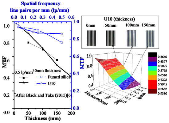The thickness of transparent soil has a significant effect on the transparency. Therefore, thicknesses of 50, 100, 150, and 200 mm for a 0.75% mixture of U10 powder were used to calibrate the transparency, The RT values of five different transparent materials versus soil thickness are shown in Figure 5, in which the signs viewed through 50 mm thickness of different transparent materials are shown on the right of the figure. The results indicated that the transparent clay manufactured using U10 has superior transparency compared with other materials and has slightly higher transparency than the fumed silica aggregate, which is a good material used to simulate natural sand. The comparative MTF values versus soil thickness and spatial frequency for the new transparent clay are shown in Figure 6. Targets of 0.02, 0.04, 0.25, and 0.50 lp/mm were used in the transparency calibration. The results indicated that the MTF values of U10 show a linear decrease versus the soil thickness, which means a linear decrease in transparency with an increasing in the sample thickness. The transparency decreased by 17% with each increase of 50 mm measured by the MTF method.