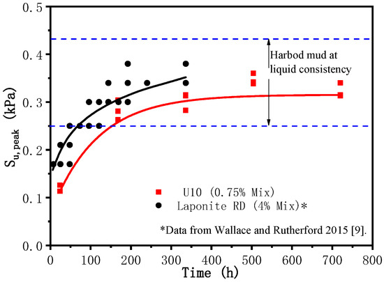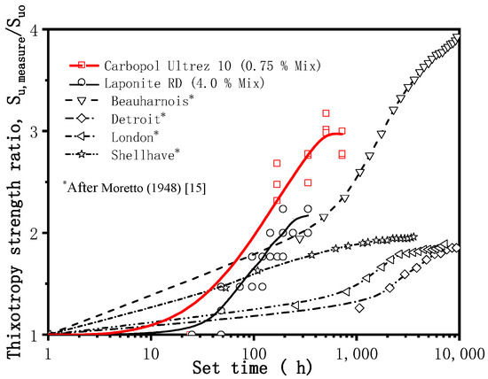 The thixotropy strength ratio of the synthetic clay (0.75% mixture), Su,peak/Suo (original undrained shear strength, Suo), in comparison with other natural clays, is shown in Figure 8 and Figure 9. Figure 8 shows the thixotropy strength ratio change versus logarithmic time. The thixotropy strength ratio changes for U10 and natural clay present the characteristics of a function curve. Results indicated a similar strength-increasing trend between the synthetic clay (made using U10) and natural ones. The change trend in thixotropy versus time can be described by a first-order exponential function for clay, as shown in Figure 9, in comparison with several natural clays, including Beauharnnois, Detroit, London, and Shellhave clays [15]; Taihu Lake- and BaiMahu Lake-dredged slurries [16]; Tianjin soft clay [17]; and other clays [18,19,20]. The fitting results are shown in Table 1, which indicates that the transparent clay manufactured using U10 has similar thixotropic properties.