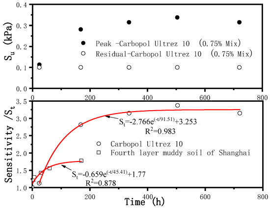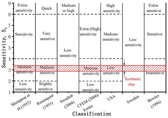 The sensitivity of soil is an indication of the reduction in shear strength of the soil when disturbed, e.g., when it is remolded or when it is subjected to monotonic or cyclic loading. Soil sensitivity is defined as the ratio of the undrained shear strength of undisturbed soil to the undrained shear strength of the remolded soil at the same water content, i.e., St = Su/Sur (where Su and Sur are the undisturbed and remolded undrained shear strengths, respectively). The ratio of the peak undisturbed strength to the remolded strength, as determined by the unconfined compression test, was used initially by Terzaghi as a quantitative assessment of sensitivity. However, the strength of some clays is so low that unconfined compression test specimens cannot be used. Therefore, the laboratory vane shear test was used in this work. The remolded shear strength was measured by manual rotation after obtaining the peak shear strength and performing an additional laboratory test. Figure 10 shows the peak strength and residual strength change versus time, while the corresponding change in sensitivity with time is shown below. The peak strength increased first and then decreased versus time, and the residual strength change versus time was steady. The sensitivity versus time of the synthetic transparent clay could also be fitted by an exponential function, similar to the natural clays (e.g., layer no. 4 soft clay in Shanghai). The sensitivity of the synthetic transparent clay ranged from low to medium. Nevertheless, synthetic clay belongs to the low-sensitivity category in other classification standards [21], as shown in Figure 11.