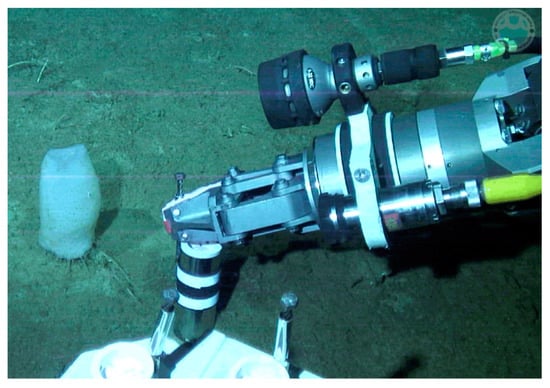 This problem was also faced during deep-sea research expeditions in the Sea of Japan, Bering Sea, and Sea of Okhotsk, with the deployment of a Sub-Atlantic Comanche 18 remotely operated vehicle (ROV) equipped with a Schilling Orion 7P manipulator [,,]. The routine collection of sediment (Figure 1), geological rock, and bacterial mat samples very often led to operator fatigue within a short period of time, to a significant increase in operation time, to errors in operations, and even to damage to working tools and samplers.