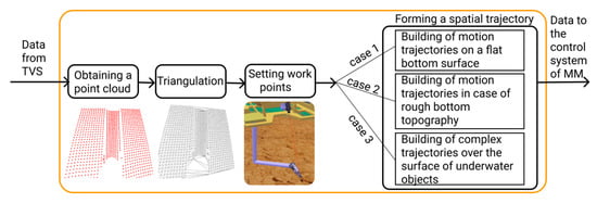 Since the method is based on spatial geometric transformations (finding intersections of the camera’s optical axis with the triangulation surface and with the subsequent projection of the desired trajectories on this surface), its accuracy depends only on the accuracy of point clouds obtained from the TVS and on the features of the triangulation algorithms used for these points. Therefore, the method can easily be implemented both in systems for semi-natural modeling and testing [] and for an actual UUV, regardless of the kinematic and dynamic features of these vehicles and their MM.