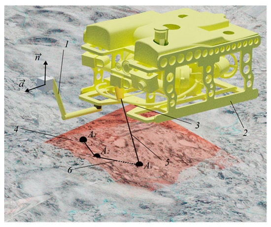 As numerous deep-sea studies [,] have shown, sampling of sediment layers and geological rocks is frequently carried out on a relatively flat seabed surface. Such a surface can be represented by an averaged plane []. To do this, it is sufficient to use point clouds of points obtained with a Doppler velocity log (DVL). A DVL has at least three hydroacoustic antennas and allows measurement of the distance from their location on the UUV hull to the bottom, along all the axes of these antennas with a high accuracy.