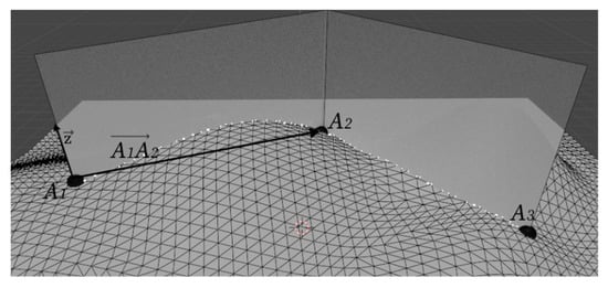 For the subsequent building of the motion trajectory for the MM working tool passing through all the obtained points , this trajectory is represented as a sequence of transects of the triangulation surface, which are the vertical profiles of its parts between neighboring target points. These profiles can be represented as a set of points of intersection of the triangulation triangles sides and the plane formed by the vector , connecting neighboring target points, and the unit vector parallel to the axis in the CS (see Figure 4).