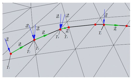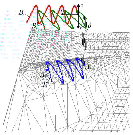 As a result, there is a set of points , through which the MM should move its working tool. Thus, at the points and , as well as during movement between these points, the vector is always perpendicular to the plane of the kth triangle, to which these points belong. Therefore, in the CS , the vector is always perpendicular to the plane defined by the three vertices of the kth triangle.