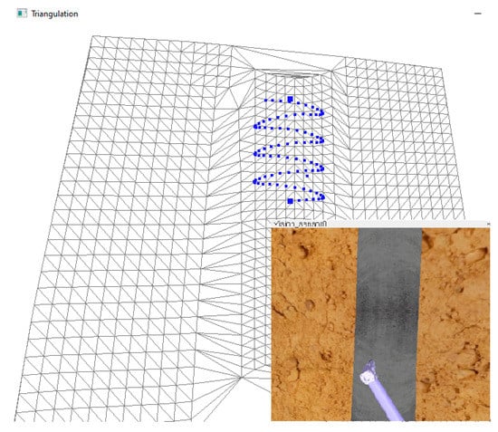 For a more precise description of the underwater objects’ shape, and also for the subsequent control of the formation of MM motion trajectories, a graphical interface was created using the OpenGL Core libraries (see Figure 7), which displays the triangulation surface of the object being observed, the trajectory projected on this surface, and the video image coming from the camera in real-time mode. Using the resulting image, the operator can check the correct construction of the automatically generated trajectory before starting a manipulative operation.