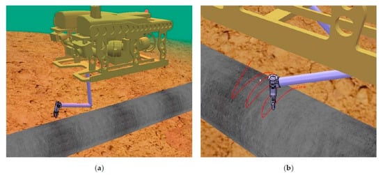 The proposed method was tested by numerical simulation in the V-REP environment. A scenario of one of the manipulative operations for cleaning a continuous pipeline from fouling is shown in Figure 8a. A model of multibeam sonar with a resolution of 32 × 32 dots and a unidirectional scanning pattern was used as the TVS. The sequence of points and their respective vectors and of the MM working tool, formed by the program, was transferred to the Matlab/Simulink via the UDP protocol. In Matlab/Simulink, the resulting sequence was smoothed using a third-order parametric B-spline []. Program control signals for the electric drives of the respective degrees of MM mobility were generated using this sequence. During the simulation, we used a well-tested mathematical model of a UUV [] with a mounted MM based on the PUMA kinematic model, which has the first five degrees of freedom (3 translatory and 2 orientation). The main parameters of the UUV and its MM are given in Table 1. All parameters of the kinematic and dynamic model of the UUV are provided in [,]. The mathematical model of the underwater MM used and its parameters are described in detail in []. This model includes a recurrent algorithm for solving the inverse dynamics problem, which takes into account not only the joint coupling between degrees of mobility of the MM, but also the effects of a viscous environment on its moving links, as well as the experimentally determined parameters of these effects []. To stabilize the UUV in the hovering mode, a combined system [,] was used, which makes it possible to compensate for the impacts of marine currents and the dynamic impacts from moving the MM, calculated in real time, with the UUV thrusters.