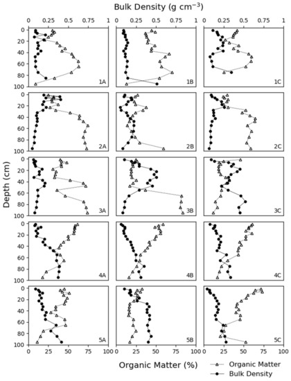 Bulk density (g cm−3) and organic matter (%) values vs. depth across 100 cm cores for sites 1−5 (subsites A, B, C) along the Nanticoke River.