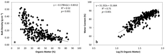 Relationships between (a) organic matter (%) and bulk density (g cm−3); and (b) the log of percent organic matter versus percent water for soil cores taken at each subsite along the Nanticoke River.