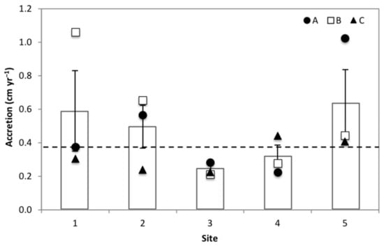 Accretion rates were expected to be highest in tidal freshwater marshes and decrease downstream as salinity levels increased; however, accretion rates were highly variable across the Nanticoke River subestuary. Only eight out of the 15 subsites had accretion rates higher than RSLR for the area (0.377 cm yr−1 for Cambridge, Maryland). The highest rates of accretion were found in the tidal freshwater and mesohaline sites (sites 1, 2, and 5). The oligohaline marshes found in the mid-estuary sites (sites 3, 4) had the lowest rates of accretion (Figure 5), with only one of the subsites (4C) accreting at a rate faster than RSLR for the area. A previous study done on the Nanticoke River using surface elevation tables (SET) to measure elevation changes also found that the mid-estuarine sites are losing elevation despite high rates of accretion [30]. Noe et al. [38] also found that long-term accretion rates measured using 210Pb dating declined downstream from the tidal freshwater forested wetlands to the oligohaline marshes, however that study only examined sites in the upper estuary. The high accretion rates found in the tidal freshwater marshes at site 5 are likely due to riverine sediment input and are consistent with accretion rates found by Kearney and Ward [23] using pollen and 210Pb analyses. They found that tidal freshwater marshes had the highest rates of accretion in the estuary, more than doubling since European settlement of the watershed.