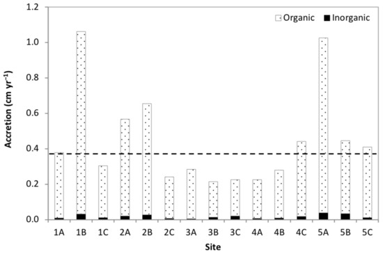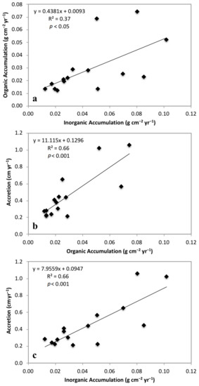 A positive relationship between both organic and inorganic accumulation rates and accretion rates was observed (p < 0.001, Figure 6b,c). Organic and inorganic accumulation each explained about 66% of the variability in vertical accretion rates. The slope coefficient for accretion vs. organic accumulation was higher than the slope coefficient for accretion vs. inorganic accumulation, suggesting that the input of organic matter resulted in a greater increase in volume than the same input of mineral matter per unit mass.