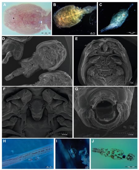 Light microscopy (LM) (A–C,H–J) and Scanning Electron Microscopy (SEM) (C–G). External morphology of L. salmonis. (A) Dorsal view of the head of an adult sea lice. (B) Dorsal view of pre-adult. (C) Dorsal view of chalimus. (D) Ventral view of the whole body of an adult L. salmonis. (E) Ventral view of a sea lice head. (F) Ventral view of an adult L. salmonis showing the mouth, maxilas and abdominal arms. (G) Detail of the ventral cavity showing the mouth and the three maxila. (H) String of sea lice eggs. In the low part of the string, two larvae are being extruded from the eggs. (I) Nauplius just hatched from the egg. (J) Copepodid of sea lice. Scale bar: (A,C,E) = 1 mm; (D) = 3 mm; (B,F,H) = 500 µm; (I,J) = 200 µm, G = 100 µm.