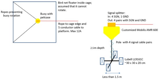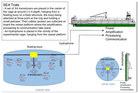 Drawing of the experimental setup. Note that the depth of the structure that holds the loud speakers was modified along the duration of the experiments. M9 loud speakers were lowered to −5 m.