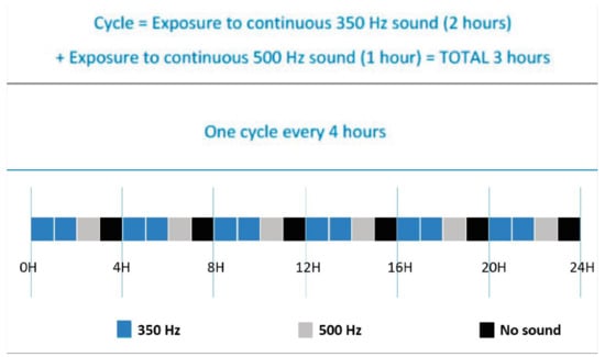 Sound exposure protocol. Note that this cycle was modified along the duration of the experiments favouring the exposure to 500 Hz to produce higher SPL.