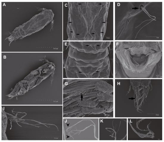 SEM. Copepodid setae morphology. Control animals: (A) Dorsal and (B) Ventral view of a L. salmonis copepodid. (C) Cephalothorax dorsal view showing some paired setae distributed along the body (arrows). (D) Detail from C shows the structure of a birrame setae (arrow). (E) Dorsal view of the abdomen showing some paired setae (arrows). (F) Mouth of the copepodid. (G) Ventral arms showing pinnate setae (arrow). (H) Caudal ramus showing the distal setae (arrow). (I) First antenna. The irregular branching tips are visible (arrowheads). (J–L) Detail of the first antenna setae showing their irregularly branching tips. Scale bar: (A,B) = 300 µm; (C,G,H,I) = 50 µm; (E) = 30 µm; (F) = 20 µm; (J,K) = 10 µm; (D,L) = 5 µm.