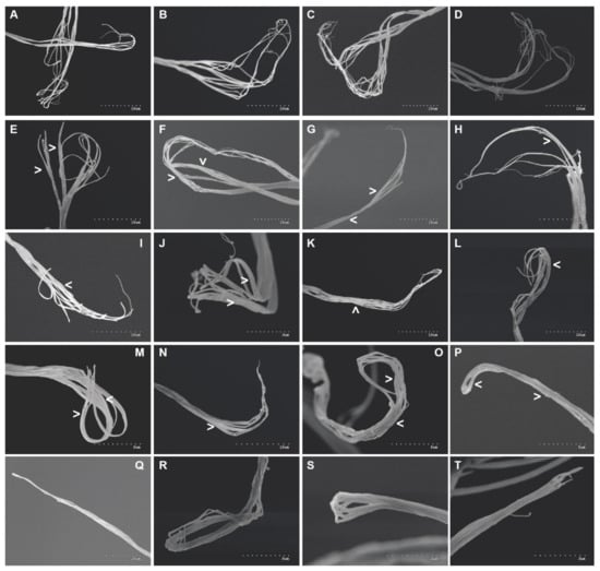 SEM: (A) L. salmonis copepodids. Setae on distal segment of first antenna; (A–D) Normal setae on control animal. The tips on the setae distal segments are entirely free (not fused); (E–H) Different views of exposed animals showing fusion (arrowheads) on the basal segment of the setae on the distal segment of the first antenna; (I–N) Different views of exposed animals showing the almost entirely fused (arrowheads) distal segment of the first antenna; (O–T) Different views of exposed animals showing completely fused distal segment of the first antenna. Scale bar: (A–I,K,L,N,Q) = 10 µm; (M,O,P,R) = 5 µm; (J,S,T) = 3 µm.