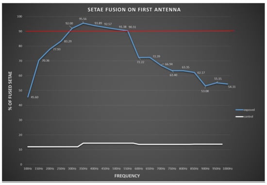 Setae fusion on sea lice first antenna (%) in function of frequency. 350 Hz achieved the maximum percentage of setae fusion. Between 350 Hz and 550 Hz the fusion percentage was higher than 90% (red bar).