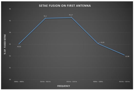 Setae fusion on sea lice first antenna (%) in function of frequency combinations of 350 Hz–450 Hz and 350 Hz. 550 Hz are the combination that achieve the maximum percentage of setae fusion (95.2%).