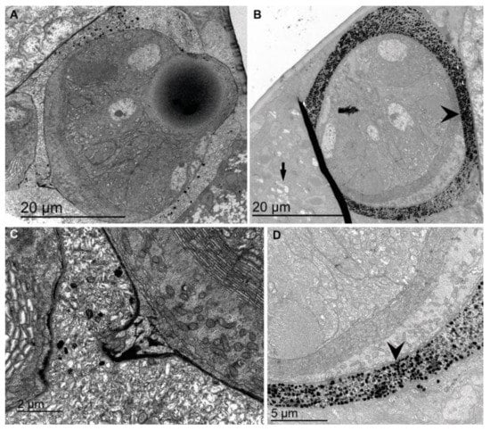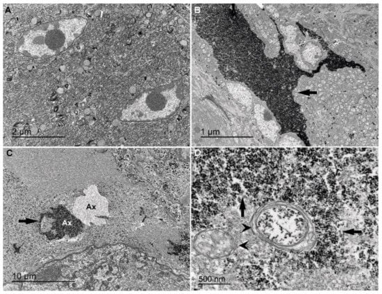 TEM. Frontal medial section of a pre-adult anterior cephalothorax showing tissues located around the eyes: (A) Control specimens; (B,C,D) Exposed specimens. (A) Normal aspect of cells in tissue surrounding the eyes. No dark inclusions are visible. (B) A large section of the cytoplasm is filled with ribosomes (dark inclusions, arrow). (C) One axon filled with dark inclusions (arrow) is adjacent located to one normal axon. (D) In the cytoplasm of an axon note the accumulation of ribosomes (dark inclusions, arrows) and the presence of autophagic vacuoles (arrowheads). Scale bar: (C) = 10 µm; (A) = 2 µm; (B) = 1 μm; (D) = 500 nm.