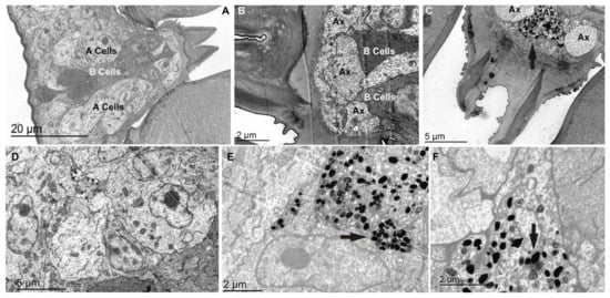 TEM. Frontal medial section of the copepodid anterior cephalotorax showing A and B Cells involved in Frontal Filament production: (A,B,D) Control; (C,E,F) Exposed: In control animals A and B cells do not show inner dark inclusions. (B) Axons sited next to A and B cells present normal aspect. (C) In exposed copepodids dark inclusions are visible in the axons of the nervous system (arrow). (D) Normal aspect of cells without dark inclusions. (E,F) Dark inclusions in the cells of exposed copepodids (arrows). Scale bar: (A) = 20 µm; (C,D) = 5 µm; and (B,E,F) = 2 µm.