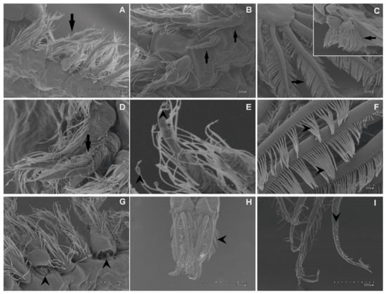 SEM. Pre-adult L-salmonis setae on proximal segment of first antenna: (A,C,H) Control animals; (B,D–G,I) animals after 2 weeks of sound exposure on sea trials. (A) Image of healthy setae bearing organized sensory hairs (arrow). (B) Setae showing flaccid or fused sensory hairs. Some of them have almost entirely lost the sensory hairs (arrows). (C) Pinnate setae on ventral arms presenting normal aspect (arrow). Insert in (C), lateral fraction of ventral arms presenting sensory hairs with normal aspect (arrow). (D) Section of proximal segment of the first antenna showing all the setae bearing bend and flaccid sensory hairs (arrow). (E) Sensory hairs showing blebs (arrowheads). (F) Pinnate setae on ventral arms are fused. (G) Setae partially ejected (arrowheads) above the antenna surface. (H) Normal aspect of the sensory hairs in the distal setae on caudal ramus. (I) Caudal ramus has partially lost the sensory hairs. Scale bar: (H) = 300 µm; (C,I); Insert in (C) = 100 µm; (F) = 50 µm; (A) = 30 µm; (B,D,G) = 20 µm; and (E) = 5 µm.