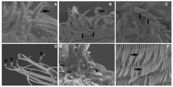 SEM. Adult L. salmonis setae on proximal segment of first antenna: (A) Control animals; (B–F): animals after two weeks of sound exposure on sea trials. (A) Image of healthy setae bearing organized sensory hairs (arrow). (B) Setae showing flaccid or fused sensory hairs. Some of them have almost lost totally the sensory hairs (arrows). (C) Some of the setae have almost lost totally the sensory hairs (arrows). (D) Sensory hairs showing blebs (arrowheads). (E) Two setae are partially (arrows) or totally ejected (arrowhead) above the antenna surface. (F) Pinnate setae on ventral arms are fused (arrows). Scale bar: (A) = 500 µm; (B,C,E,F) = 30 µm; and (D) = 5 µm.