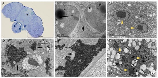 (A) Light microscopy; (B–F) TEM. Frontal medial section of a chalimus stage of sea lice; (A–C) Control specimens; (D–F) 3 weeks exposed specimens. (A) In light microscopy images of control animals there are not specially stained areas (corresponding to dark inclusions in TEM). Arrowhead shows the eyes. (B) Eyes of a control animal. The axons of the central nervous system surrounding the eye did not show dark inclusions (arrow). (C) Normal B cells nucleus (yellow arrowheads) in a control animal. (D) Dark inclusions in A cell cytoplasm are visible (arrows). (E) A large section of the cytoplasm of A cells are filled with ribosomes (dark inclusions, arrow). (F) By comparison to C, the B cell nuclei on exposed animals presented irregular shapes and chromatin compaction (yellow arrowheads). Scale bar: (A) = 200 µm; (B) = 20 µm; (C,D) = 5 µm; (E,F) = 2 µm.