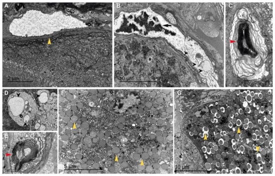 TEM. Frontal medial section of a chalimus anterior cephalothorax: (A,F) Control specimens; (B–E,G) 3 weeks exposed specimens. (A) There are no dark inclusions visible in the central nervous system axons (yellow arrowhead) neighbours to the eye. (B) One axon of the central nervous system shows ribosome accumulation (arrow) and presence of double-membrane-bounded autophagic vacuoles (arrowheads). (C,E) “Myelin-like formations” (red arrowhead). (D) Double-membrane-bounded autophagic vacuoles (arrowheads). (F) Normal aspect of the tissue located next to the B cells. (G) the tissue shows a process of vacuolization (yellow arrowheads). Scale bar: (B,G) = 10 µm; (F) = 5 µm; (A,C,D) = 2 μm; (E) = 1 µm.