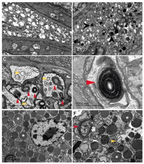 TEM. Frontal medial section of a chalimus anterior cephalothorax: (A,E) Control specimens; (B,C,D,F) Six weeks exposed specimens. (A) Normal aspect of the central nervous system between the two eyes. (B) By comparison to A, large dark inclusions (black arrowheads) are visible in the central nervous system between the two eyes. (C) “Myelin-like formations” (red arrowheads) and double-membrane-bounded autophagic vacuoles (yellow arrowheads) are present in axons. (D) Detail of “myelin-like formations” in an axon (red arrowhead). (E) Normal lysosomes (white asterisks) next to the B cell nuclei. (F) Some degraded lysosomes (white asterisks) are visible in a B cell of an exposed animal. “Myelin-like formations” (red arrowhead) and autophagic vacuoles (yellow arrowhead) are present. Note the empty cytoplasm in some areas of the tissue (black asterisks). Scale bar: (A–C,E,F) = 2 µm; (D) = 1000 nm.