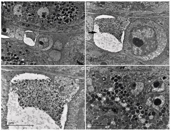TEM. Frontal medial section of an exposed pre-adult anterior cephalothorax. Exposed animal: (A) General view of a section of tissue showing different features on sound exposed cells (Details in B–D); (B) Two adjacent cells are visible. On the right a normal cell shows its nucleus with inner nucleolus. On the left (arrow) a sound affected cell shows organelles destroyed by an enzymatic process; (C) Detail from (B,D), presence of very dark lysosomes (asterisks). Scale bar: (A) = 10 µm; (D) = 5 µm; and (B,C) = 2 μm.