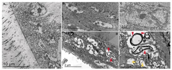 TEM. Sagittal section of adult sea lice anterior cephalothorax: (A–C) control animals; (D,E) Exposed animals; (A–C) No abnormal features are visible. (D) Cells present large empty areas in the cytoplasm (asterisks). Red triangles point to “myelin-like formations”. (E) Detail from D. Note the double-membrane-bounded autophagic vacuoles (yellow arrowheads), the empty areas of cytoplasm (asterisk), the “myelin-like formations” (red arrowheads) and ribosome accumulation (arrow). Scale bar: (A) = 10 µm; (B–D) = 2 µm; (E) = 1 μm.