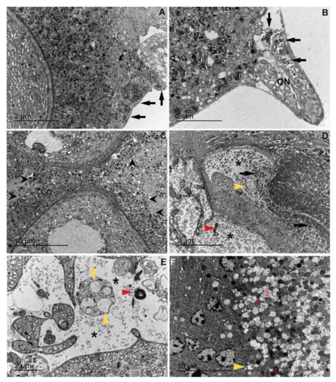 TEM. Frontal medial section of exposed adult anterior cephalothorax showing tissues located around the eye. (A) Arrows point to cells of the central nervous tissue filled with dark inclusions (ribosomes). (B) Detail from the optic nerves (ON) showing ribosome accumulation (arrows). (C) The axons of the central nervous system between the two eyes present some large dark inclusions (arrowheads). (D,E) Cells of the central nervous system shows autophagic vacuoles (yellow arrowheads), empty areas of cytoplasm (asterisks), “myelin-like formations” (red triangles) and ribosome accumulation (arrows). (F) The large amount of lysosomes type 3 suggest the evolution sequence of lysosomes going from the darkest (1) to lightest (3) appearance probably linked to sustained autophagy. Yellow arrowhead points to a type 3 lysosome releasing their inner content to a next autophagosoma. Scale bar: (C,F) = 10 µm; (A,B,D,E) = 2 µm.