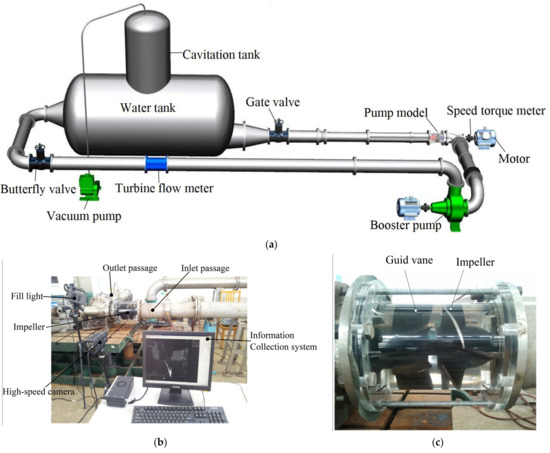 Figure 3 shows the equipment for the tests of the axial-flow pump’s external characteristics and the cavitation experiment. The test loop consisted of a gate valve, an axial-flow pump model, a butterfly valve, a boosting pump, a turbine flow meter, and a water tank, as shown in Figure 3a. A cavitation tank located above the loop was connected to a vacuum pump, which was used to adjust the pressure at the pump inlet to achieve different cavitation number conditions. The water tank with a large water storage capacity kept the flow and water temperature relatively stable. A honeycomb wall was installed in the center of the water tank to improve flow uniformity and reduce the scales of inflow turbulence. Pressure transducers were installed in the inlet and outlet pipe of the pump to calculate the pump head. The flow rate was measured by a turbine flow meter. The speed torque meter was installed to measure the shaft speed and power.