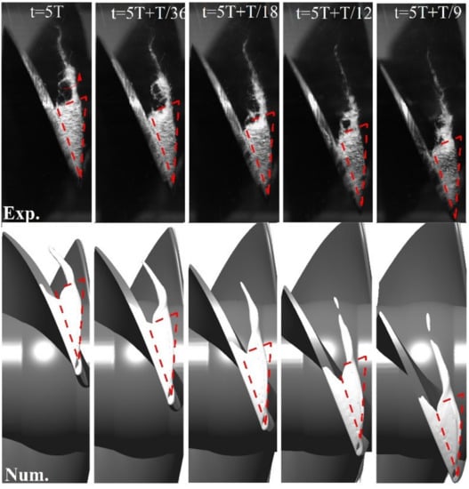 (2) Under the QBEP standard operating conditions, transient calculations were carried out. The obtained images of the cavitation volume fraction isosurface () were compared with the experimental flow images under the same working conditions (). As shown in Figure 5, the numerical simulation result was close to the experimental result.